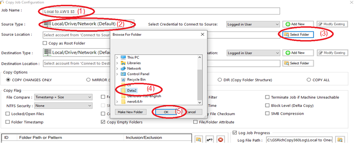3) Name the job (1) , Source type “Local/Drive/Network” (2) , click “Select Folder” (3) , Browse and choose your folders/files (4) , then choose “OK” (5)