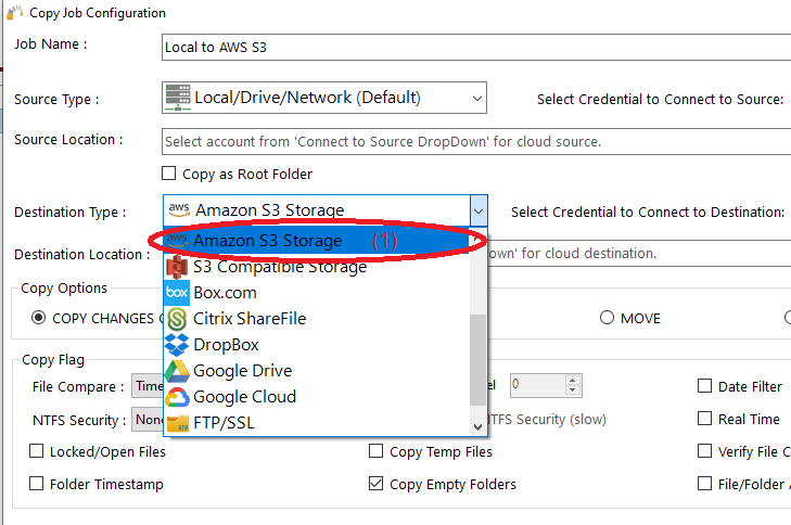 4) From Destination type, choose “Amazon S3 Storage” (1)