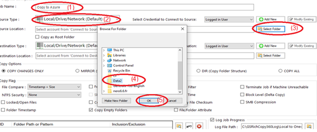 3) Name the job (1), Source type “Local/Drive/Network”(2), click “Select Folder”(3), Browse and choose your folders/files (4), then choose “OK” (5)