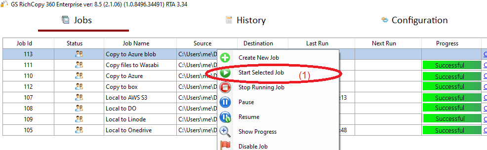 7) Your job will be created as below, Right Click on the job and then choose “Start Selected Job” (1) to run the job