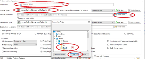 3) Name the job (1) , Source type “Local/Drive/Network”(2), click “Select Folder”(3) , Browse and choose your folders/files (4),then choose “OK” (5)