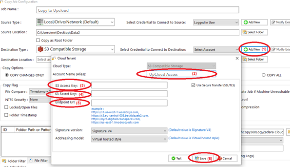 5) Choose “Add new”(1) to add the UpCloud S3account , write any name for this account (2) , enter the S3 acess key (3), enter the S3 secret key (4),enter the endpoint Url (5) , then click “Save” (6)