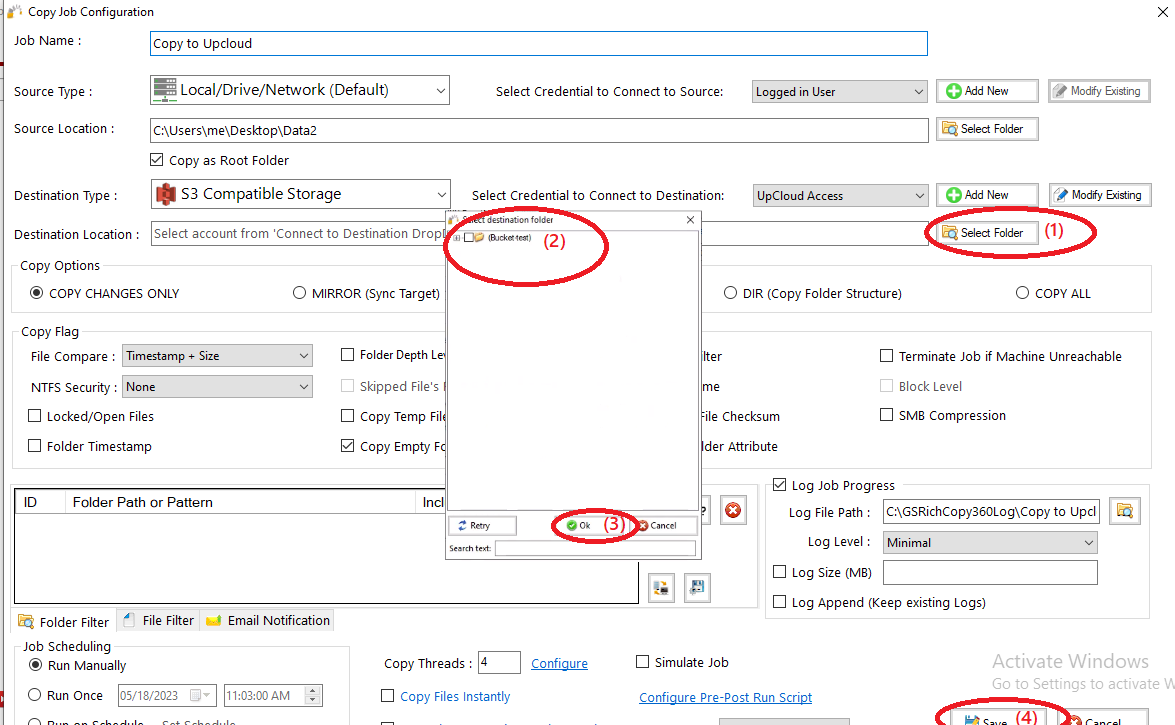 6) Click “Select Folder”(1) , choose the destination folder (2) , click “OK”(3) , then click “Save”(4)