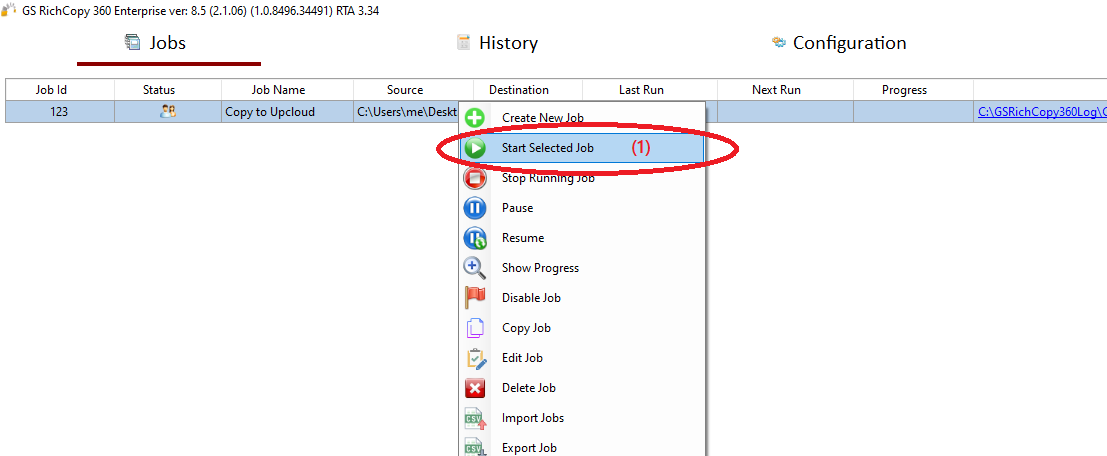 7) Your job will be created as below, Right Click on the job and then choose “Start Selected Job” (1) to run the job